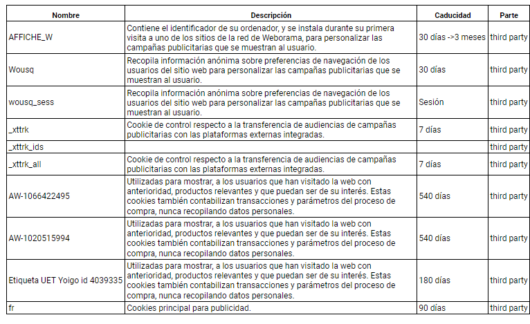 - Cookies de publicidad comportamental: son aquéllas que permiten la gestión, de la forma más eficaz posible, de los espacios publicitarios que, en su caso, el editor haya incluido en una página web, aplicación o plataforma desde la que presta el servicio solicitado. Estas cookies almacenan información del comportamiento de los usuarios obtenida a través de la observación continuada de sus hábitos de navegación, lo que permite desarrollar un perfil específico para mostrar publicidad en función del mismo. En el apartado 3 se identifican las cookies que concretamente son instaladas.